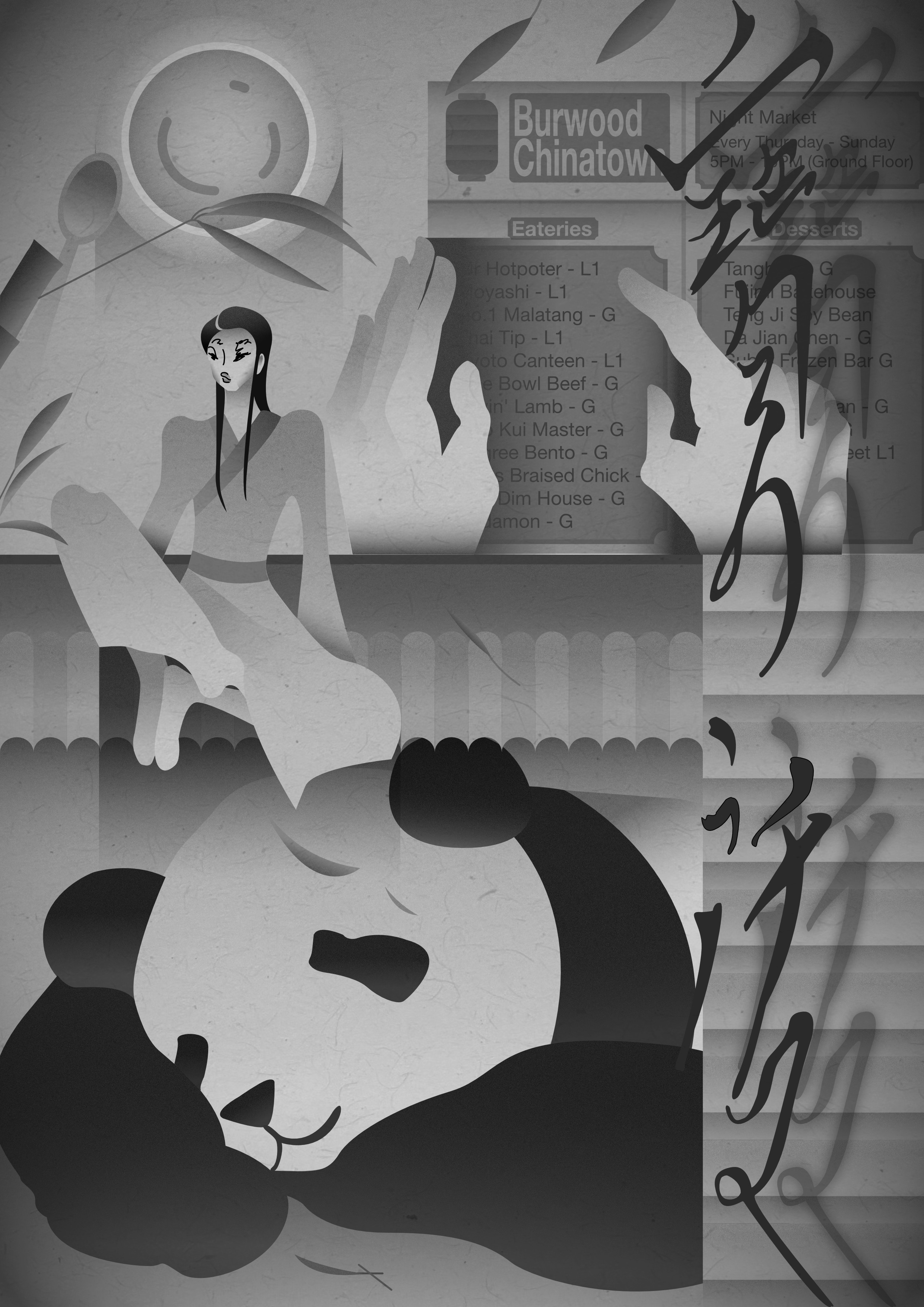 Between Worlds is a vector-based illustration for the Burwood Art Prize, reimagining Burwood Chinatown through a subtle, surreal lens. Blending traditional Chinese ink aesthetics with digital execution, it reflects the evolution of cultural identity across contexts, designed to scale across print, spatial, and public art applications.